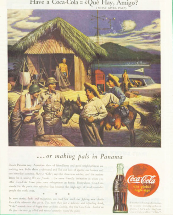 强大的宣传攻势过后,美国政府决定可口可乐生产所需的食糖不受定额限制。1943年6月29日,艾森豪威尔在北非给美国陆军参谋长马歇尔发出急电:“本军先行要求300万瓶可口可乐,以及每月可以生产两倍数量的完整装瓶、清洗封盖设备,请提供护航。”图为1943年,美军在巴拿马。