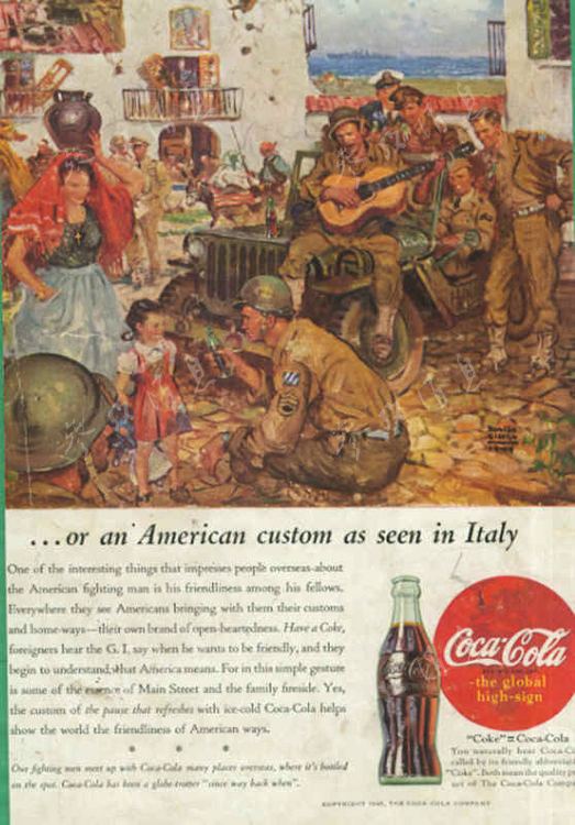 还有一点不可忽视,那就是可口可乐与骆驼牌香烟、咖啡、巧克力和尼龙丝袜,都变成了战时美国大兵异国猎艳的“撒手锏。图为1945年,美军与意大利民众联欢。