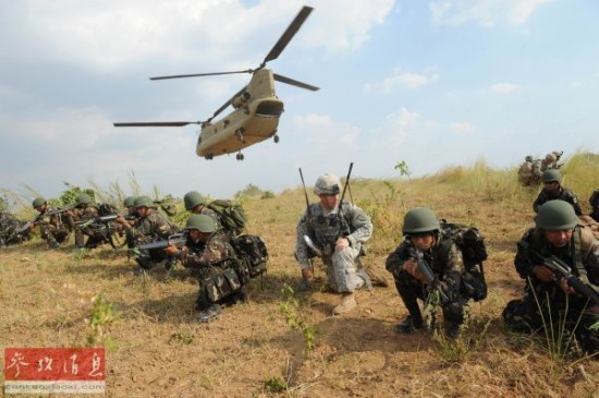 美菲两国军人20日开始在马尼拉北部一处训练基地进行机降演习(法新社)