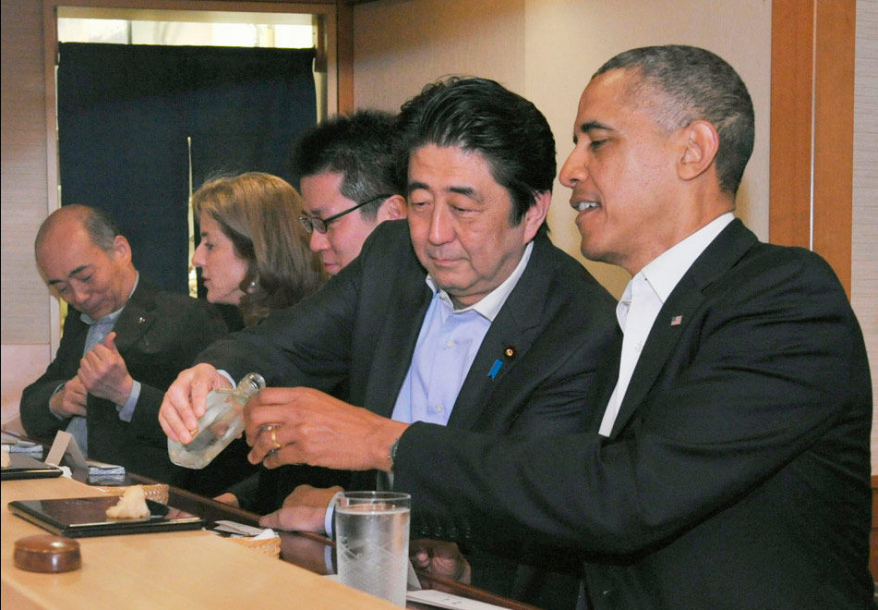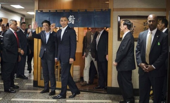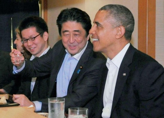 2014年4月23日,奥巴马抵达东京,当晚安倍在寿司店宴请奥巴马。