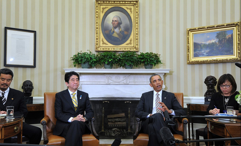 2013年2月22日当天,安倍与奥巴马会晤瞬间。