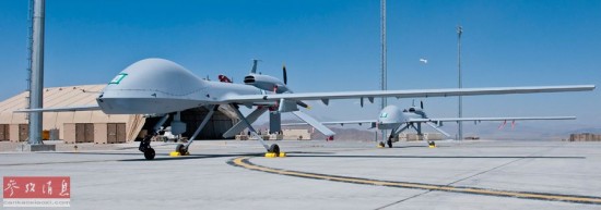2012年4月11日,在阿富汗卢格尔省的一处前线基地,两架“灰鹰”无人机停在停机坪上。新华社/法新
