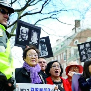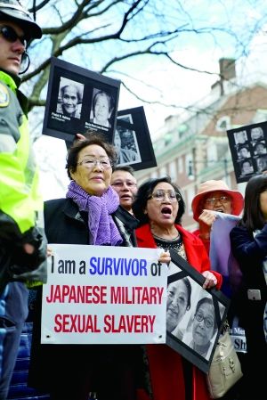 安倍发表演说当天,哈佛大学学生和日本强征慰安妇受害者聚集会堂外,手举标语,高喊口号,要求安倍停止否认历史事实,明确就日本军队二战暴行道歉。