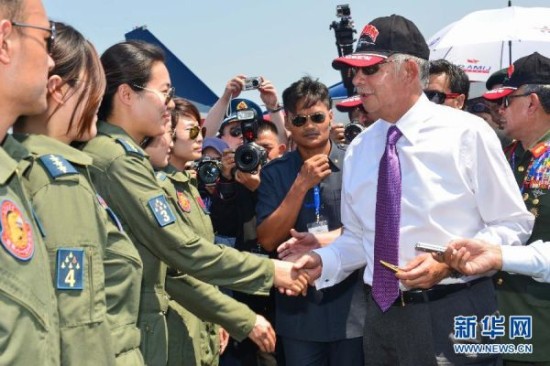 3月17日,在马来西亚兰卡威,马来西亚总理纳吉布(右)与中国女飞行员握手。