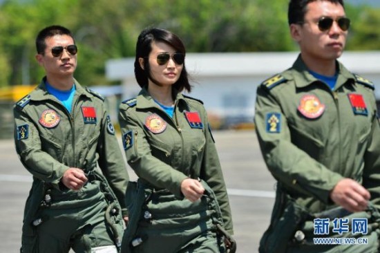 3月17日,在马来西亚兰卡威,中国女飞行员余旭(中)准备执行飞行任务。