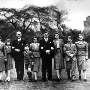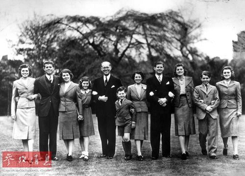 1939年,时任美国驻英大使老约瑟夫·肯尼迪(左五)一家在伦敦美国大使馆合影,左二为后来入主白宫的约翰·肯尼迪。(资料图片)