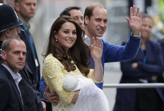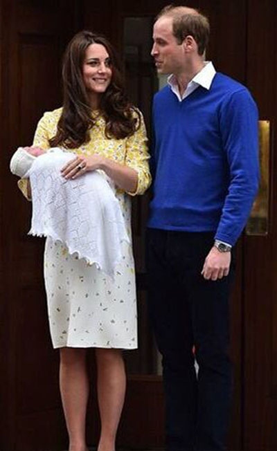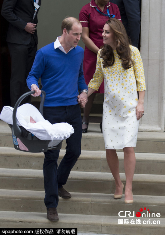 威廉和凯特带着刚出生的小宝宝从伦敦圣玛丽医院的林都翼(Lindo Wing)门外台阶走下来,在外守候的祝贺人群响起一片欢呼声。
