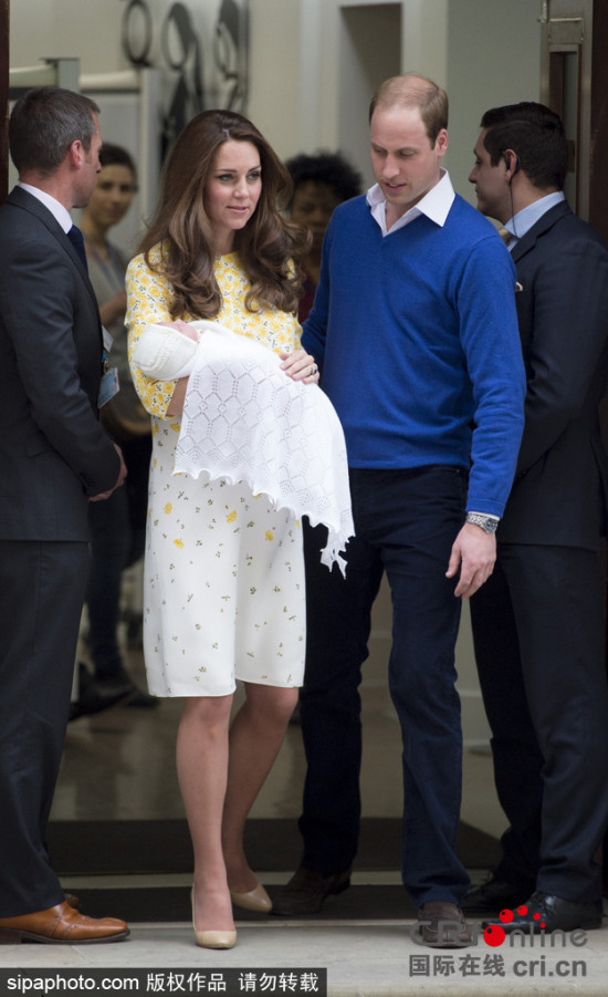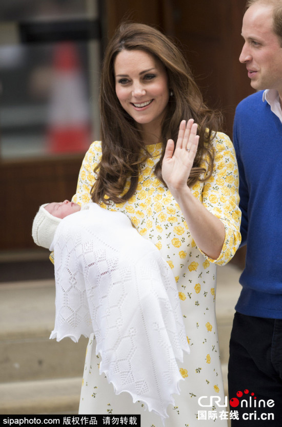 小公主裹在白色的毯子里,全程闭着眼睛,似乎在妈妈的怀里安静地睡觉。凯特穿着白底印黄色小花的连衣裙,精神看上去相当不错。她与威廉夫妇二人离开医院时在门前站了一会,向等候的民众和媒体人挥手问好。