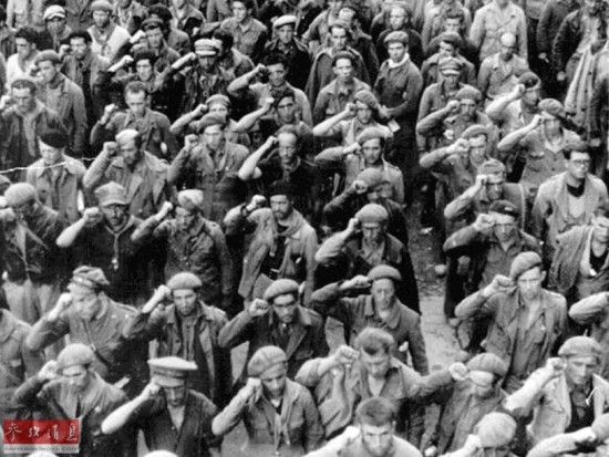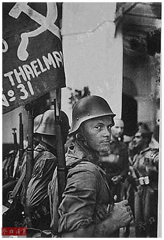 在1936年12月的马德里保卫战中,参战的国际志愿者达4万人左右。马德里保卫战是国际纵队第一次亮相,也把共产国际推到了西班牙政治的聚光灯下。图为国际纵队中赫赫有名的德国“台尔曼支队”,他们在战场上与身为同胞的秃鹰军团兵戎相见,势不两立。