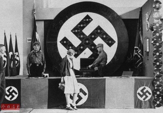 1933年3月,四位纳粹党卫军成员在柏林的伍尔沃思百货公司柏林分店门口唱歌,当时纳粹党正在进行抵制犹太人的运动;希特勒的党徒们认为伍尔沃思公司的创始人是犹太人。