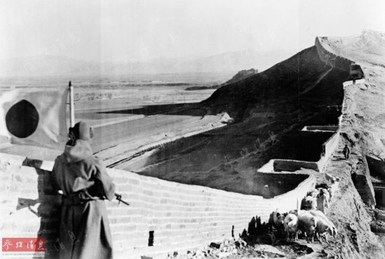 1937年中日战争期间,日军士兵在已被占领的长城上站岗。