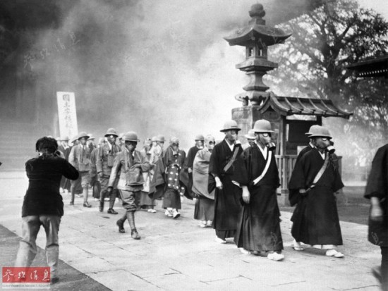 1936年5月30日,日本政府加紧备战,为全面侵华做准备。图为东京大浅草寺的和尚正带着防毒面具接受防空演习。