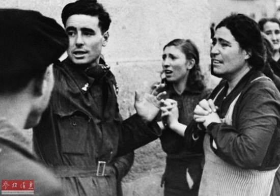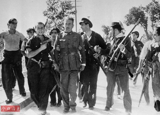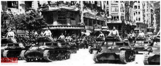 1939年1月26日,巴塞罗那不战而降。几十万共和国军和难民开始了向法国的大逃亡。图为佛朗哥的军队进入巴塞罗那。