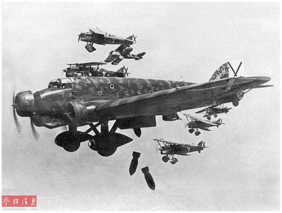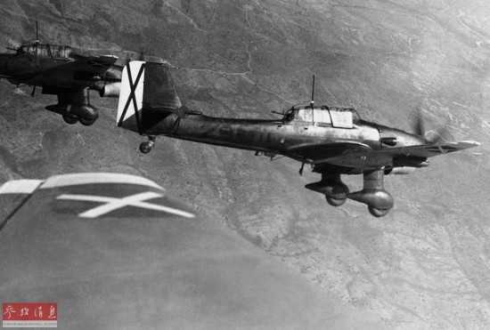 1939年5月30日,西班牙内战期间,德国的轰炸机(隶属于德国的“秃鹰军团”)在西班牙上空战斗。机翼和尾翼上的黑十字是佛朗哥空军的标志。