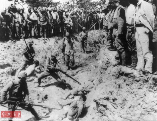 在一个壕沟里,日军士兵正在用刺刀屠杀中国战俘,其他日军士兵站在沟边上观看杀人。