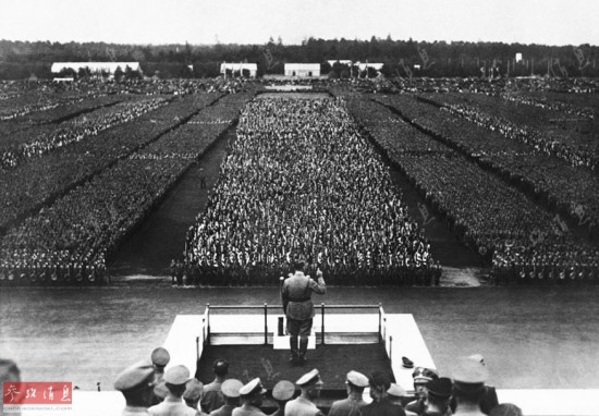 1935年9月11日,在德国纽伦堡成千上万的德国青年正在国家社会主义党的大会上认真听取他们的领袖希特勒的讲话。