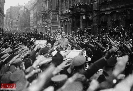 1933年11月3日,在庆祝德国国家社会主义运动创立十周年的日子里,阿道夫希特勒的车队行进在慕尼黑的街道上,接受来两旁亲纳粹分子的欢迎和敬礼。