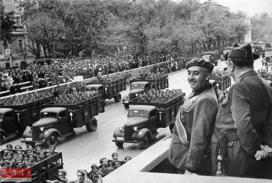 1939年3月27日上午11点,佛朗哥占领马德里。4月1日,佛朗哥宣布,西班牙内战结束。图为佛朗哥在马德里阅兵。
