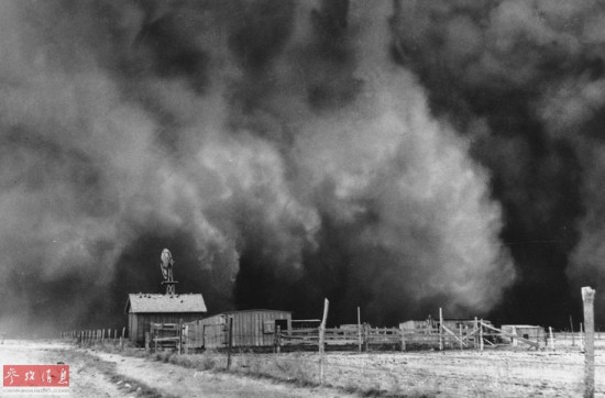 1935年4月15日,沙尘暴慢慢逼近俄克拉荷马州的波伊斯城,这个平静的牧场即将被吞噬。在美国中北部地区黑色风暴肆逆的年代里,农田里的表层土壤被吹干并席卷而去。严重的干旱、不良的耕种技术以及毁灭性的风暴造成数百万英亩的良田变成荒漠。