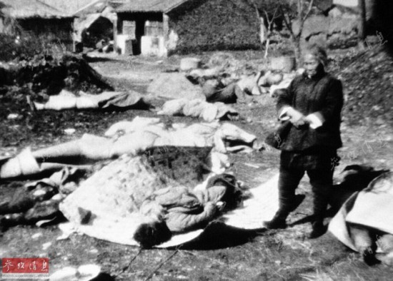 1938年2月5日,一位在南京大屠杀后幸存下来的老太太正在辨认尸体,她一家人都在日本军人占领南京的过程中被杀害了,由于日军士兵的的暴行有大量平民被屠杀。