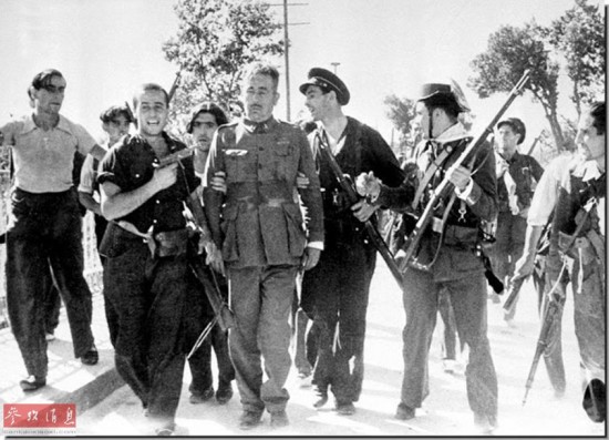 一位投降的西班牙叛军正被押往简易军事法庭受审,周围众多的志愿军和平民警卫正在嘲弄他。