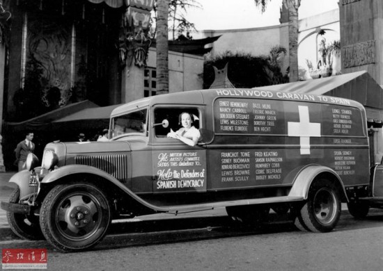 1937年9月18日,赖特·卡恩坐在一辆美国电影界为西班牙政府募捐的车内。好莱坞车队穿越美国大陆,沿途以“帮助西班牙民主的捍卫者”的名义为西班牙内战募捐。