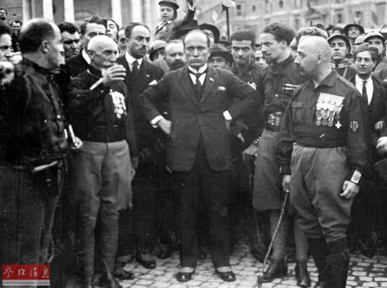 1922年10月28日,在完成向罗马进军之后,意大利法西斯党的领袖贝尼托·墨索里尼正和他的党徒们站在罗马市内。这次进军是一次威胁性的行动,一路上数千名法西斯黑衫队员纷纷占领途径的各个意大利战略要地。行军结束后,意大利国王埃玛诺来三世不得不请墨索里尼来组成新政府,为墨索里尼的独裁扫清了道路。