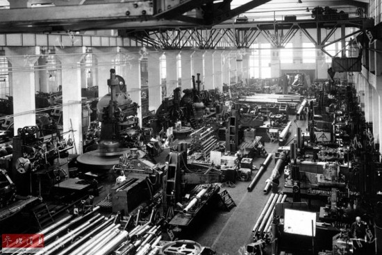 1939年8月13日,德国,杜塞尔多夫的莱茵金属武器工厂的一个大车间,这里主要生产炮筒。在二战开始前,德国工厂里生产的武器是以每年数百件计的。不久就增加到每年数万件。