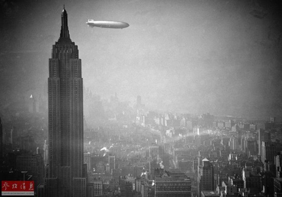 1938年8月8日,齐柏林飞艇兴登堡号飞越纽约曼哈顿的帝国大厦。齐柏林飞艇从德国起飞飞越大西洋降落在新泽西州的莱克赫斯特。