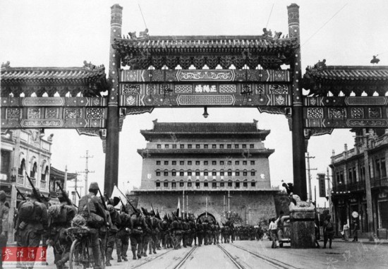 1937年8月13日,日军占领北平后的第一批照片。举着太阳旗,日军部队经正阳门列队入城,直抵紫禁城。离此不远处就是美国领事馆,在中日交战最激烈的时期,许多住在北平的美国人纷纷躲进了领事馆。