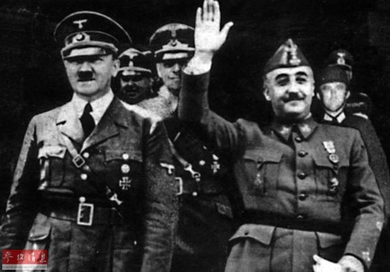 内战爆发后,佛朗哥派出特使赴德请求军援。1936年7月25日,佛朗哥特使与德国航空部长戈林会晤。7月26日特使见到希特勒。图为佛朗哥与希特勒。