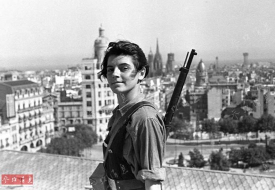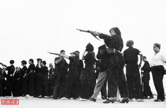 1937年6月2日,西班牙内战期间,西班牙拥护共和政府的士兵正在教妇女射击,以便保卫巴塞罗那,抵抗弗朗西斯科·佛朗哥率领的法西斯叛乱部队。