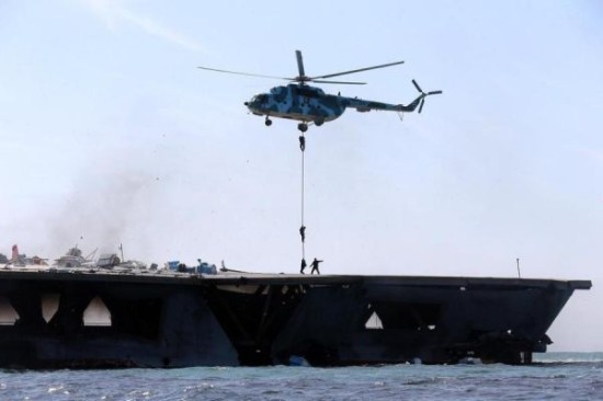当地时间2015年2月25日,伊朗海军在霍尔木兹海峡举行军事演习,演习中伊朗海军对模拟美军航母的靶舰发起轮番进攻,甚至动用快艇向其发起狼群攻击,士兵搭乘直升机索降该靶舰。