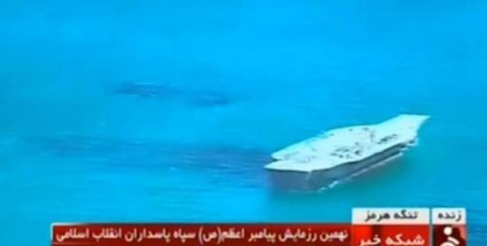 伊朗国家电视台播放了美国航母模型遭到伊朗导弹袭击的录像画面。画面并未显示航母沉没,但很多西方新闻机构报道称它被击沉。