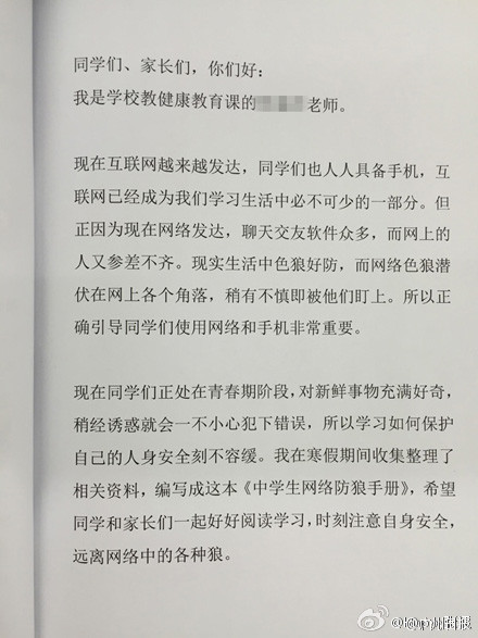 广州日报消息 青岛学生网友小清爆料:刚开学健康教育课老师就发了一份《中学生网络防狼手册》让大家学习,里面的案例分析真是生(bu)动(ren)形(zhi)象(shi),竟然还有男生防狼篇,内容简直是醉了,节选了一部分你们感受下。