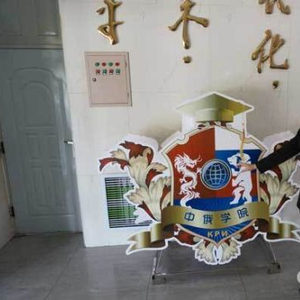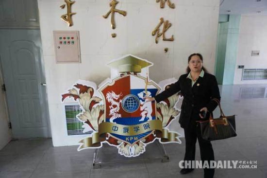 中俄学院院长贾旭杰正在向大家介绍学院院徽。(中国日报记者 任奇摄)