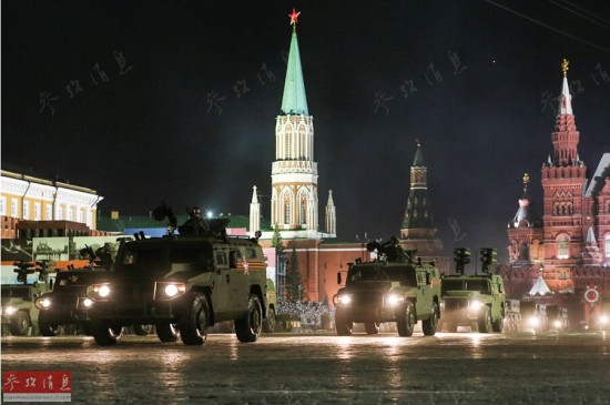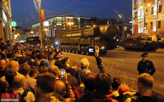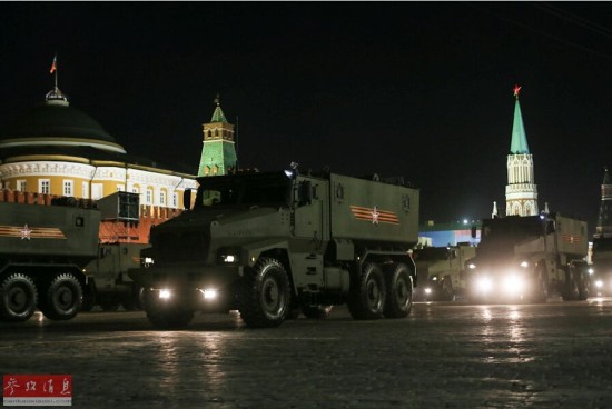 图为夜间彩排时,RS-24导弹发射车通过红场。