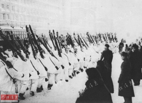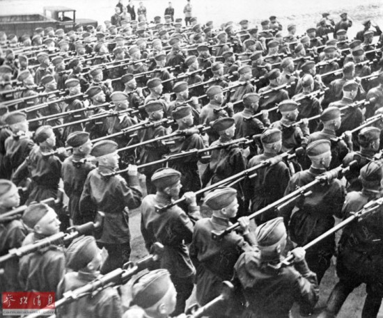 应该承认,民兵战士的样子不够雄赳赳,不像受阅的样子。但是有谁会责备这些民兵战士队形不整呢。书写“一个冬天神话”的,就是这样的一群人。图为参加阅兵的苏联红军将士。