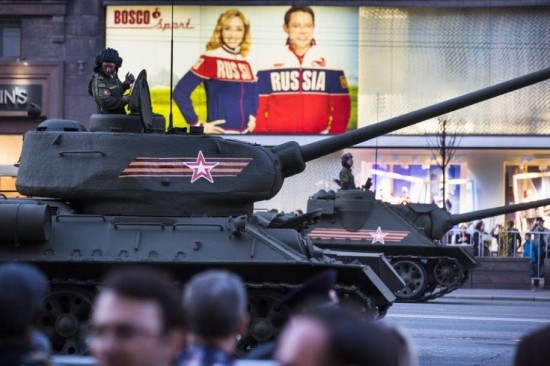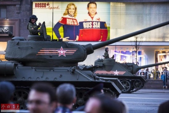 在今年的阅兵式上,我们仍将能看到1945年胜利阅兵式上的经典装备,T-34(85)坦克和SU-100坦克歼击车。图为两种战车在彩排仪式上并肩行进。