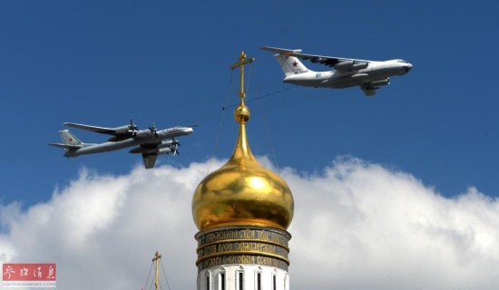 图为伊尔-78加油机(右)和图-95MS轰炸机组成的空中加油编队飞越红场。