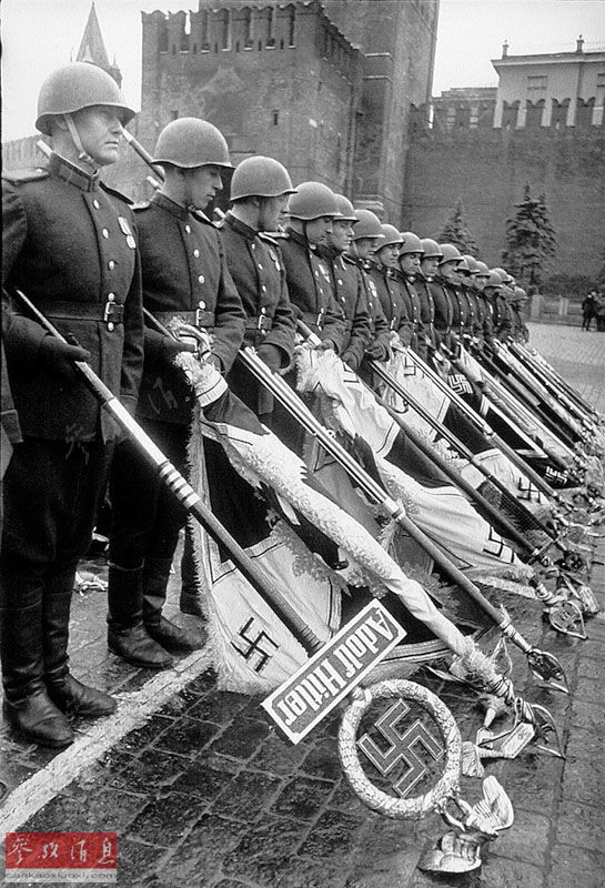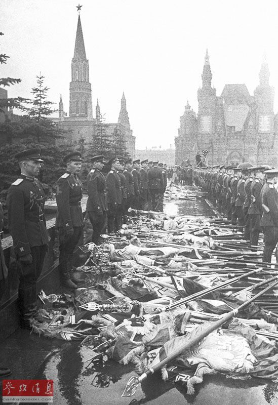 最振奋人心的场面在阅兵式接近尾声时出现。检阅台前走过一支由内务部捷尔任斯基师的200名官兵组成的特殊纵队,他们倒持着200面德军旗帜在被雨打湿的条石路面上拖行。