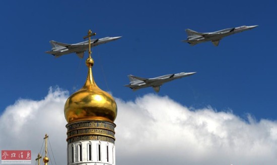 图为图-22M3战略轰炸机编队飞越红场。