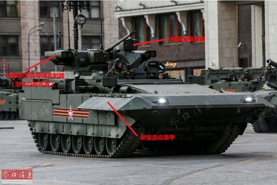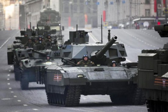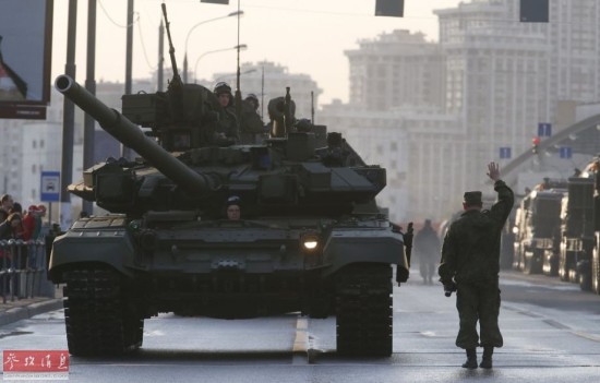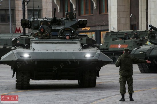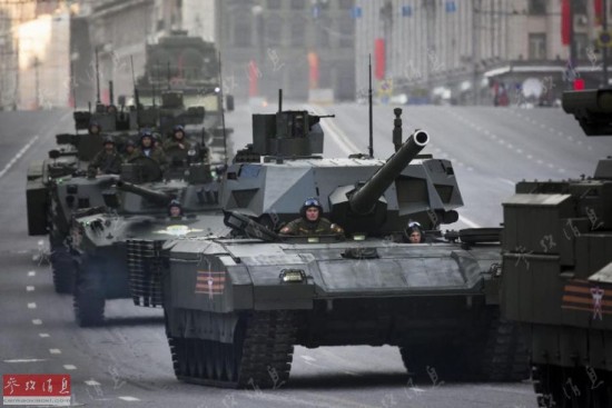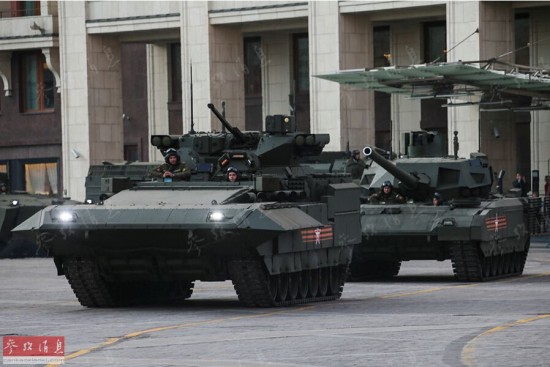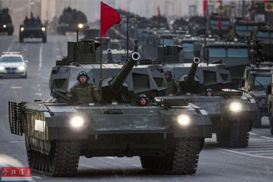 与俄军现役战车一同行驶在莫斯科街头的T-14新型坦克。