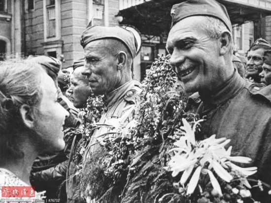 载誉归来、征尘未洗的老兵们受到年轻姑娘的热情欢迎。