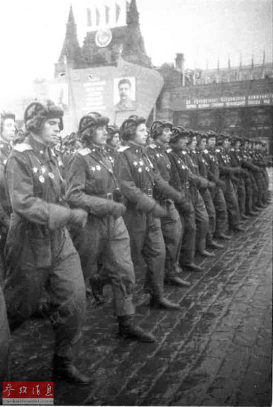 全副武装的苏联红军部队,迈着雄健的步伐从红场列宁墓前走过,接受了最高统帅们的检阅,走在最前面的是军校学员方队,在此次纪念活动中,他们仍然走在前面,其中有不少女学员。