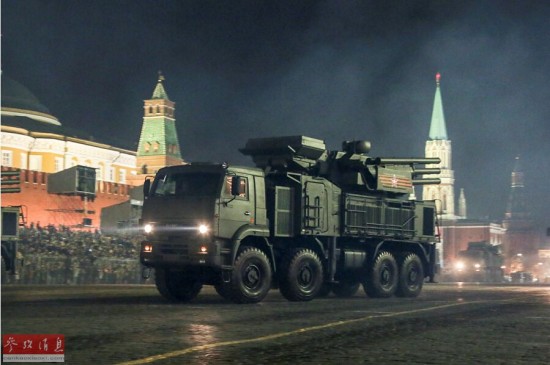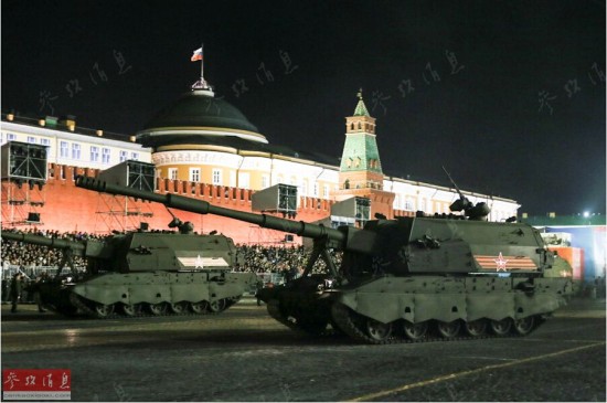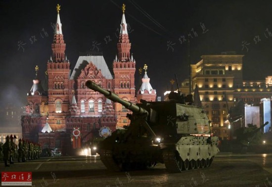 图为夜间彩排时,联盟SV火炮通过红场。