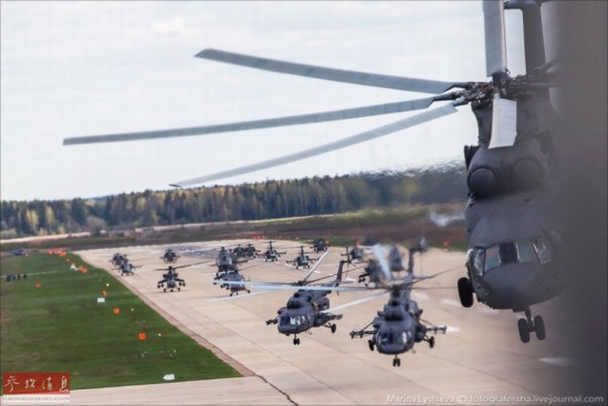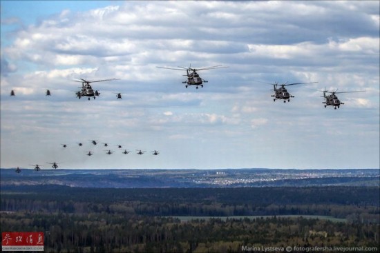 从2008年开始,红场上空开始有航空器加入阅兵式,今年也不例外,图为参与此次阅兵式的军用直升机编队密集起飞。