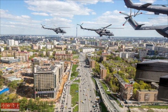 受阅直升机编队飞越莫斯科市区。