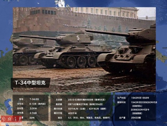 下面挑选此次阅兵中最有代表性的装备进行介绍,首先是T-34(85)中型坦克,这是苏军在遭遇德军虎式坦克之后,为T-34升级火力后的改进型。