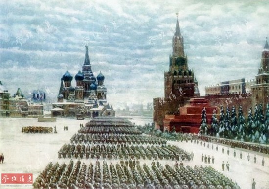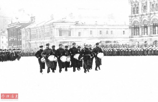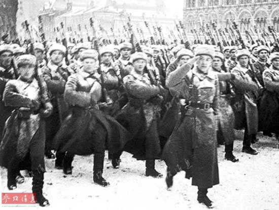 1941年11月7日清晨,一场纷纷扬扬的大雪把莫斯科所有的街道染得雪白。首都军民在飘着雪花的初冬雾霭中,在红场举行了盛大的独具风格的十月革命24周年阅兵式。当时纳粹德国军队已经到达莫斯科附近,但斯大林决定如常举行阅兵并在阅兵式上发表了著名的演说,受阅部队接受完检阅后随即开赴前线作战。